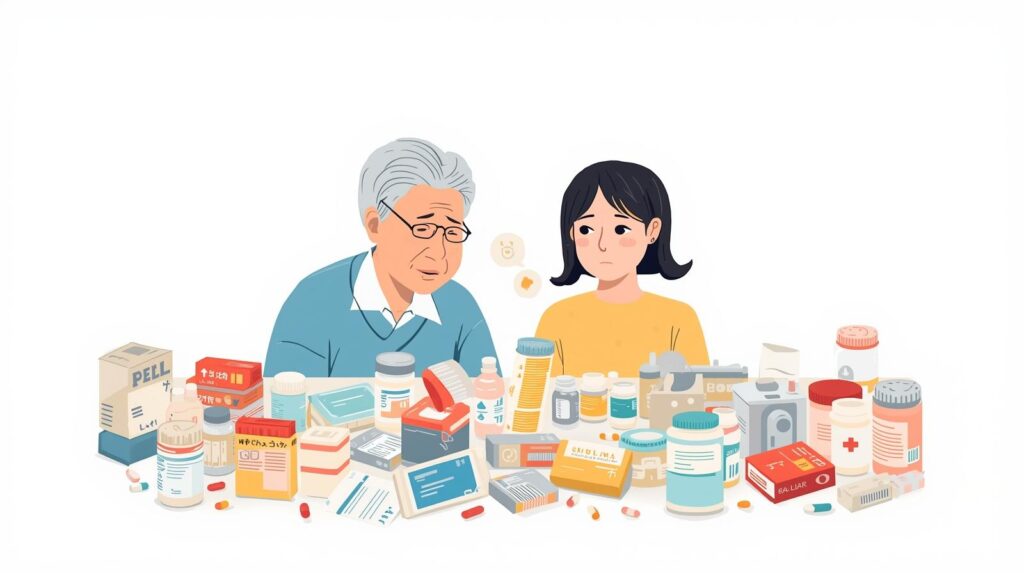 親の手元には「血圧の薬」「痛み止め」「目薬」「夜間頻尿の薬」と、別々の目的の薬が、一つずつ足されていきます。